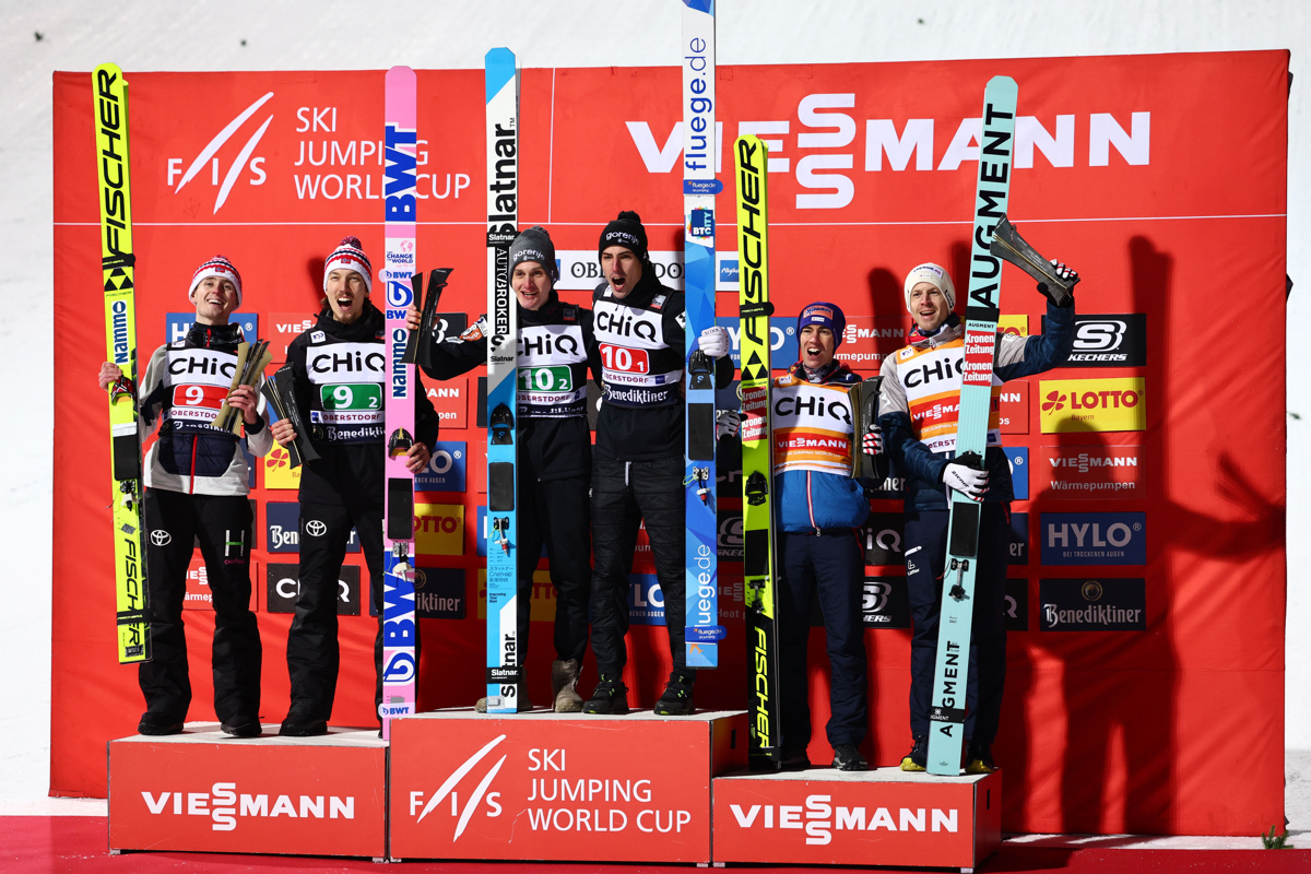 "Za nami je zelo lepa tekma. Z Domnom sva pokazala, da znava super leteti, in mislim, da sva zasluženo zmagala," je povedal Timi Zajc, ki je zelo dobro odprl tekmo in slovenski tandem povedel v vodstvo. Takrat je bila druga Poljska (zaostanek 12,6 točk), tretja Norveška (17,1), ki pa je ob odličnem poletu Johanna Andrea Forfanga (234,5 m) prepolovila zaostanek in se pomaknila tik za naša orla. Prevc se je pognal z dveh zaletišč nižje, a kljub temu doskočil pri 222,5 m, Zajc pa je ob odličnem drugem poletu (233 m) pristal še v telemark in prednost pred zasledovalci je poletela v nebo (26,6).