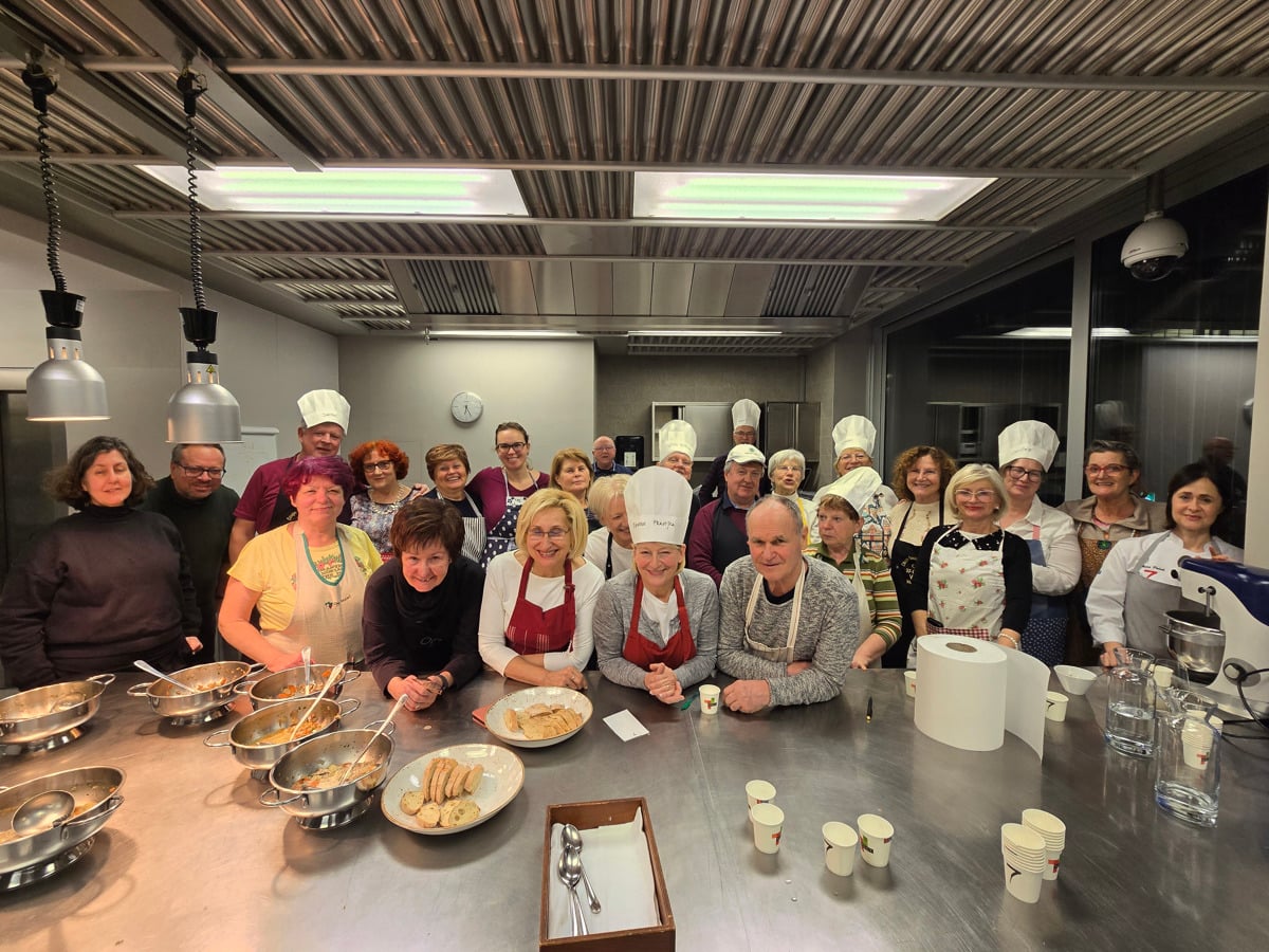 Ker program temelji na celostnem doživljanju Pohorja, smo se na U3ŽO odločili, da se poleg narave, zgodovine in gozdne kulture posvetimo tudi pohorski kulinariki. Na Višji strokovni šoli za gostinstvo in turizem Maribor so z direktorico Mojco Polak na čelu idejo takoj prepoznali kot priložnost za povezovanje znanja, tradicije in generacij. Skupaj smo zasnovali in izvedli odličen projekt – medgeneracijsko kuharsko delavnico Dišeča gobova juha. Sodobna šolska kuhinja je udeležence navdušila že ob prihodu. Mojca Polak je uvodoma pozdravila, predstavila šolo, njen izobraževalni pristop ter način dela v kuhinji, ob tem pa poudarila pomen spoštovanja hrane, znanja in sodelovanja. Kuhanje je nato potekalo v raznolikih skupinah, saj so se člani U3ŽO delavnice udeležili s prijatelji, otroki in drugimi družinskimi člani, pri delu pa so jim pomagali tudi študenti VŠGT Maribor. Sodelovanje različnih generacij je dogodku dalo poseben pečat – znanje se je prenašalo v obe smeri, izkušnje so se prepletale, kuhinja pa je postala prostor povezovanja. Pomemben vsebinski del je prispeval tudi Slavko Šerod, predsednik Gobarskega društva Lisička Maribor, ki je udeležencem predstavil gobe, njihov pomen v kulinariki ter opozoril na odgovorno in varno uporabo gob v prehrani.