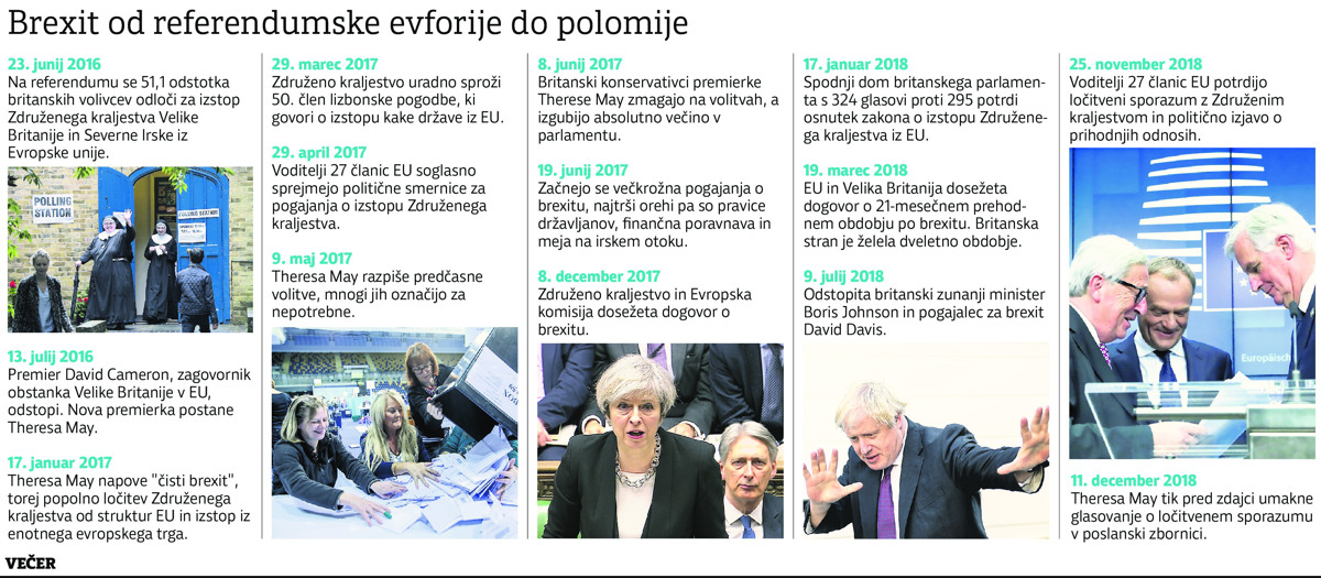 Deset tednov pred za 29. marec napovedano ločitvijo Združenega kraljestva Velike Britanije in Severne Irske ni jasno skoraj nič več: ali se bo brexit sploh zgodil, ali se bo, a ne tako hitro, bo v tem primeru možen s sedanjim ali prenovljenim ločitvenim sporazumom z Evropsko unijo - ali pa ga sploh ne bo. Odgovora nista dala niti današnji, zadnji dan dolgotrajne razprave v spodnjem domu britanskega parlamenta niti glasovanje o ločitvenem sporazumu, ki bi moralo biti že decembra, a ga je premierka Theresa May zaradi nepodpore tako imenovanemu mehkemu brexitu preložila za štiri tedne. V tem času je skušala (neuspešno) prepričati poslance, naj podprejo dogovor in s tem tudi njo, a razmerje sil se ni spremenilo; tako kot decembra ji je poleg opozicije hrbet obrnil tudi velik del poslancev njene konservativne stranke. Tudi nocoj se je izkazalo, da je bil njen trud zaman: dogovor o brexitu in s tam Mayevo je podprlo 202 prisotnih poslancev spodnjega doma, 432 jih je bilo proti.