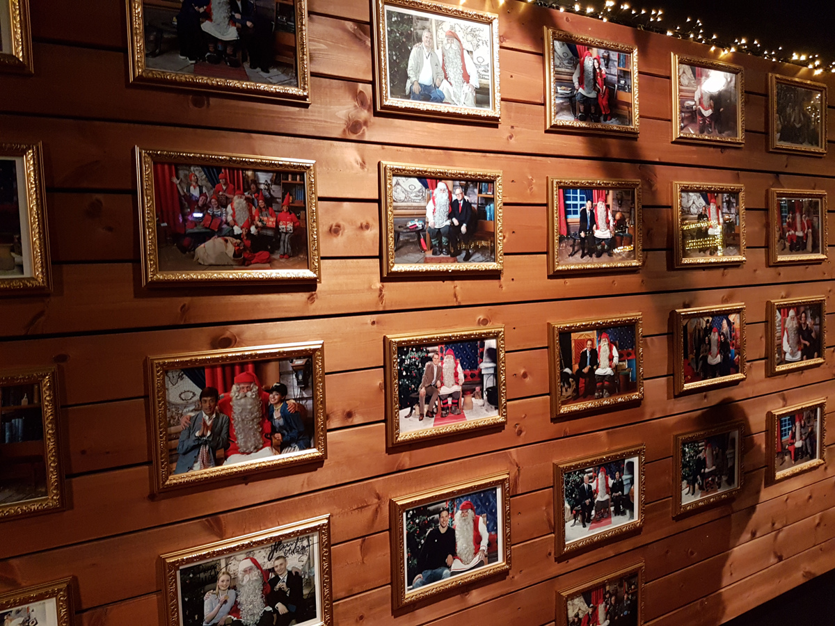 Na poti do radostnega srečanja smo se sprehodili še mimo stene mnogih slavnih osebnosti, ki so se v preteklosti že fotografirale z Božičkom. Kakor hitro vam škrat, Božičkov pomočnik umakne rdeči trak, pa lahko vstopite v sobo in mu pomahate, se z njim fotografirate, pogovorite. Toda, pozor! Težko je spregledati napis, ki prepoveduje uporabo lastnih fotoaparatov. Zakaj? Ker vam sicer ne bi mogli zaračunati spomina na vaš obisk, je pa res, da boste ob nakupu fotografije v digitalni obliki lahko prejeli tudi video vašega obiska. Sicer brez zvoka, a je vseeno vredno tistih nekaj deset evrov.