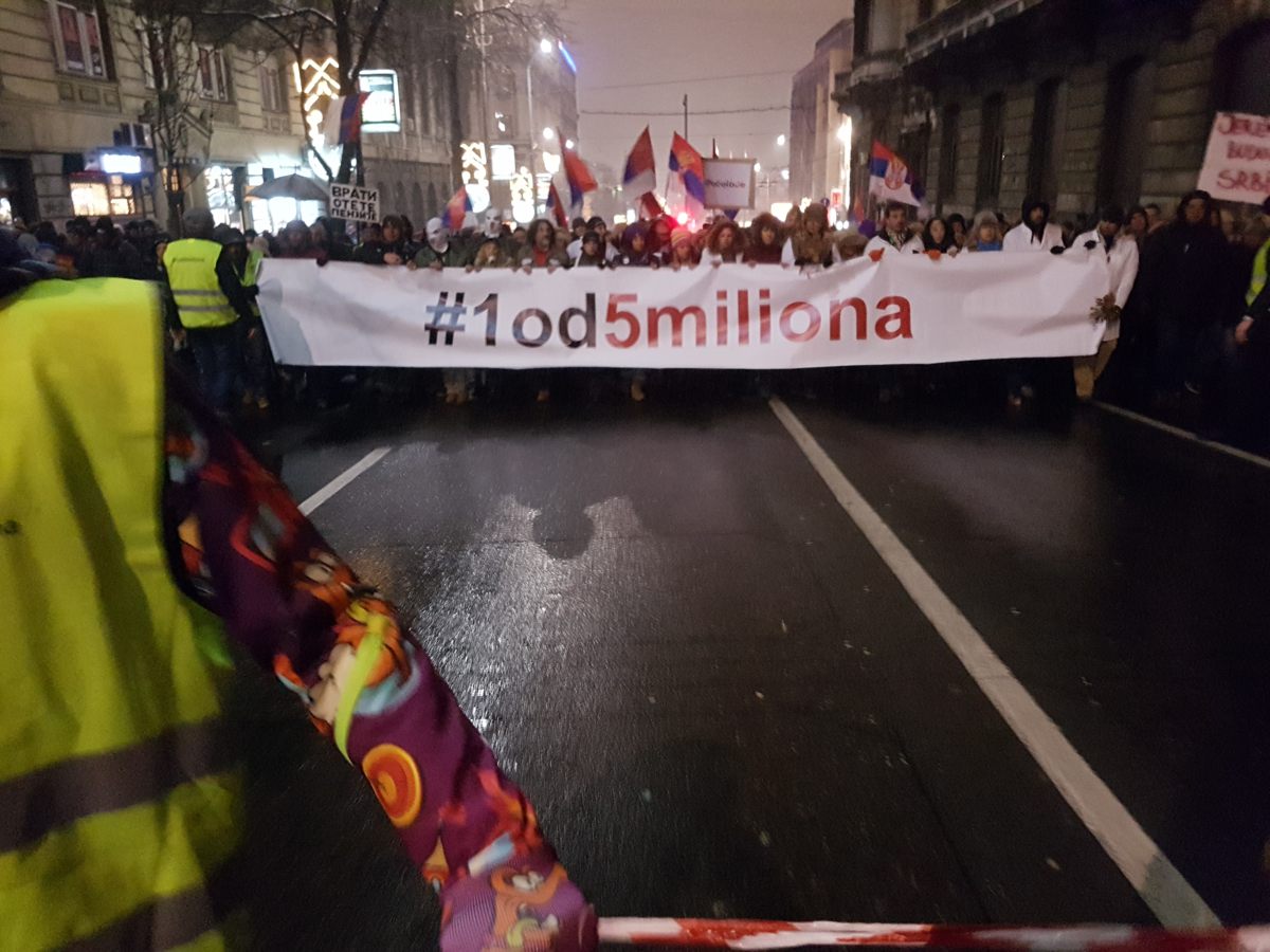 Nocojšnji protest v Beogradu se je z začel z minuto molka za te dni umrle "jugoslovanskega" nogometaša Dragslava Šekularca, kot je pred množico dejal eden od vodij protestov Branislav Trifunović, in še za filmskima igralcema Ivom Gregurevićem iz Hrvaške ter Markom Nikolićem iz Srbije.