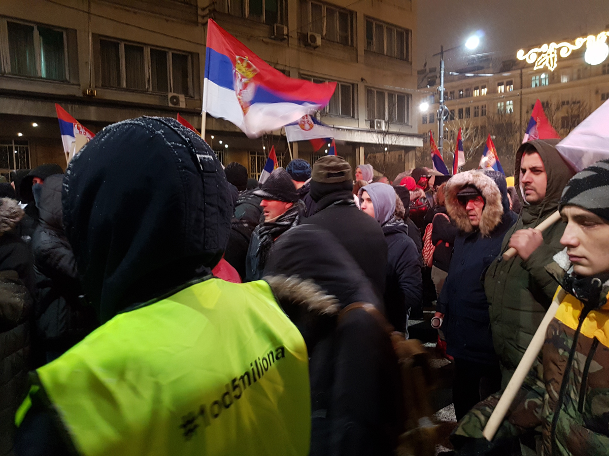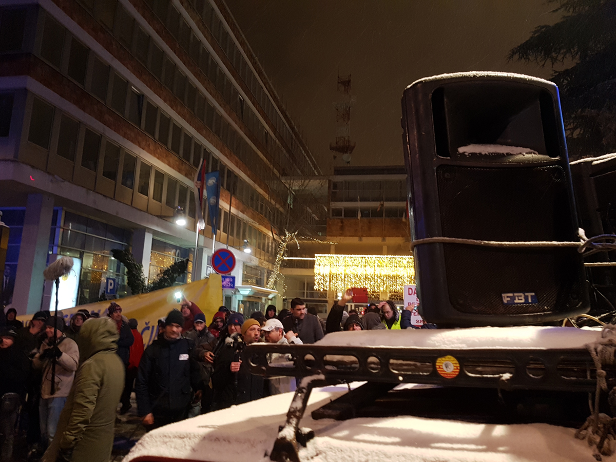 Kolona je v rahlem sneženju po zvokih Ekatarine Velike krenila s Studentskega trga proti sedežu Radiotelevizije Srbije ob hrupu bobnov, rogov in piščalk.