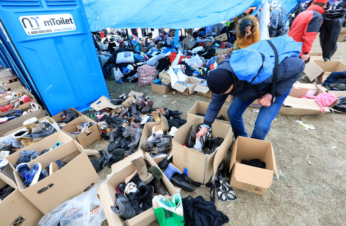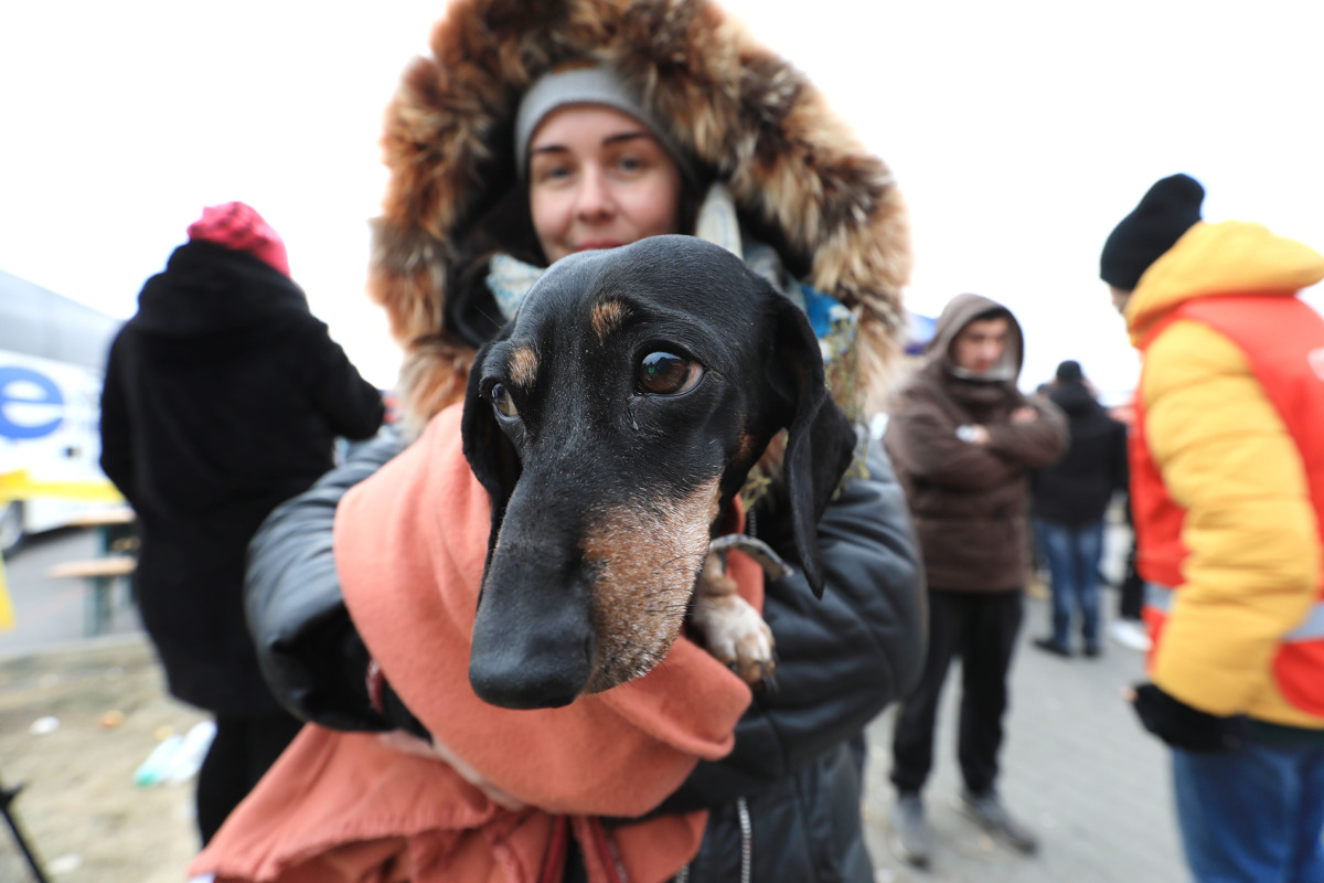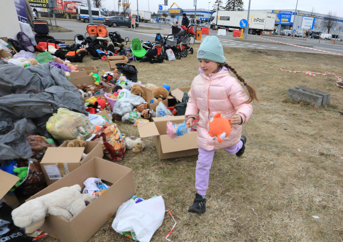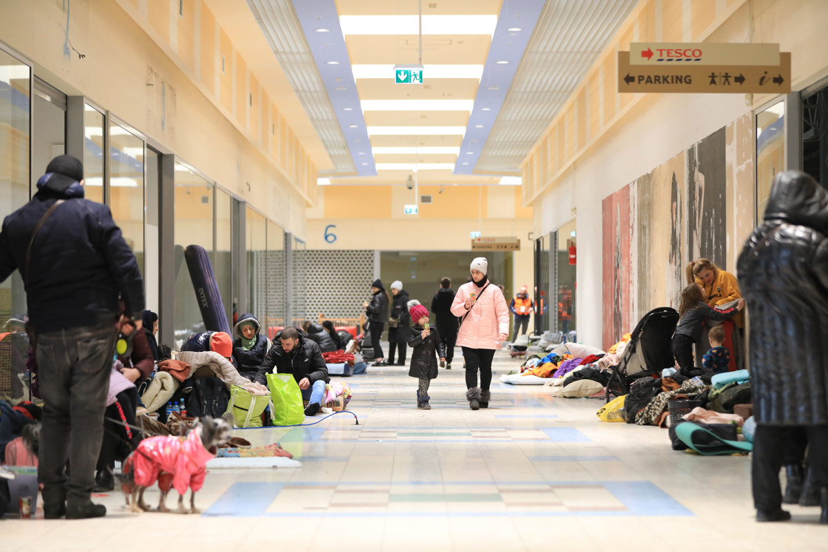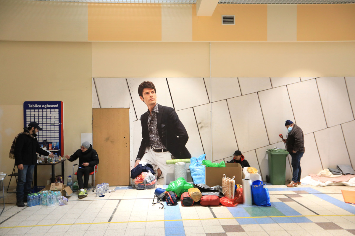 S seboj so vzeli tudi svoje domače živali, največ je kužkov, ki so videti prav tako prestrašeni kot njihovi lastniki. Trgovski center zraven parkirišča, kjer so vzpostavili postaje z donacijami, so organizatorji sicer spremenili v neke vrste spalno naselje: v notranjosti sicer ni postelj, a so si ljudje prostor za počivanje uredili po najboljših močeh. Ogromno je prav družin, žensk in majhnih otrok. Presenetilo pa naju je, da s strani Poljakov, ki tukaj pomagajo oziroma koordinirajo center, ni čutiti nobene napetosti in živčnosti, ki bi bila v takih razmerah sicer pričakovana. Prostovoljci se trudijo s ponujanjem dobrin, naokrog nosijo sokove, pa tudi številne igrače za otroke, da jim vsaj malo olajšajo neznosno čakanje v nepredstavljivo težkih časih.