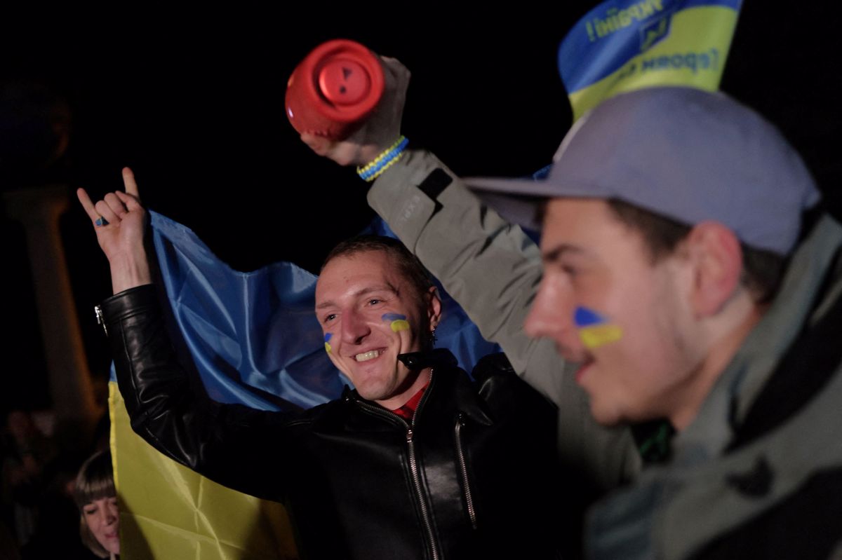 Video posnetki prikazujejo ulice, polne ljudi, ki mahajo z ukrajinskimi zastavami, pojejo domoljubne pesmi in objemajo vojake, poročajo tuji novinarji v Hersonu.