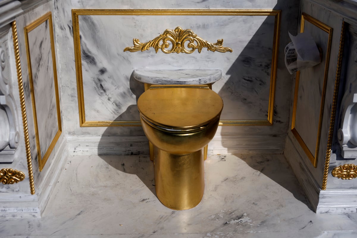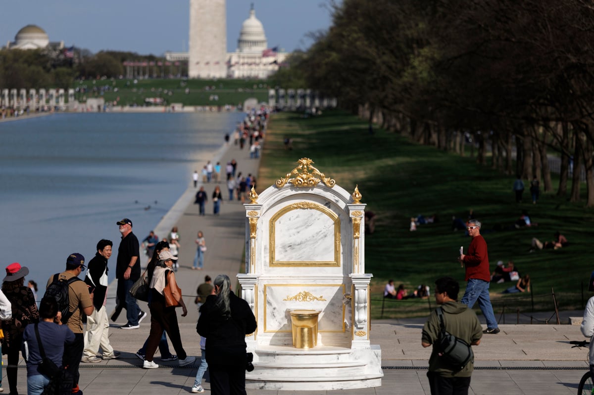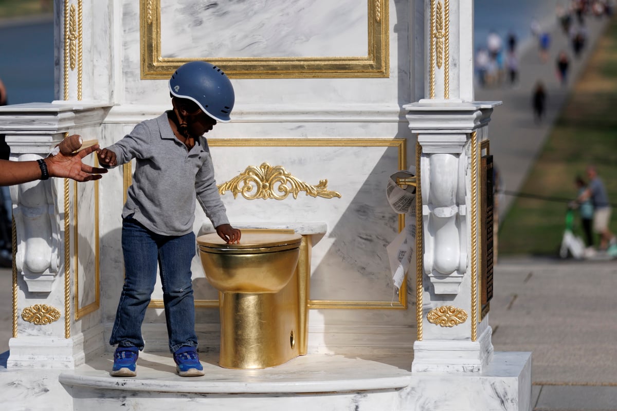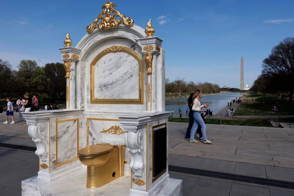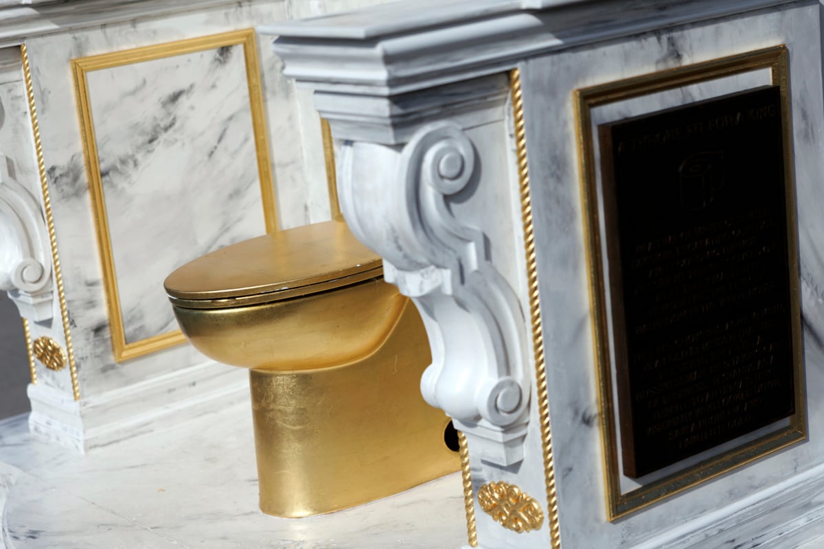Nedaleč od Bele hiše v Washingtonu so mimoidoči pred Lincolnovim spomenikom opazili neobičajno umetniško delo. Gverilska umetniška skupina je tam postavila razkošen podstavek iz umetnega marmorja, v središče pa so umestili zlato straniščno školjko. S satiro so želeli opozoriti na aktualnega ameriškega predsednika Donalda Trumpa, ki obožuje marmor in zlate detajle.
