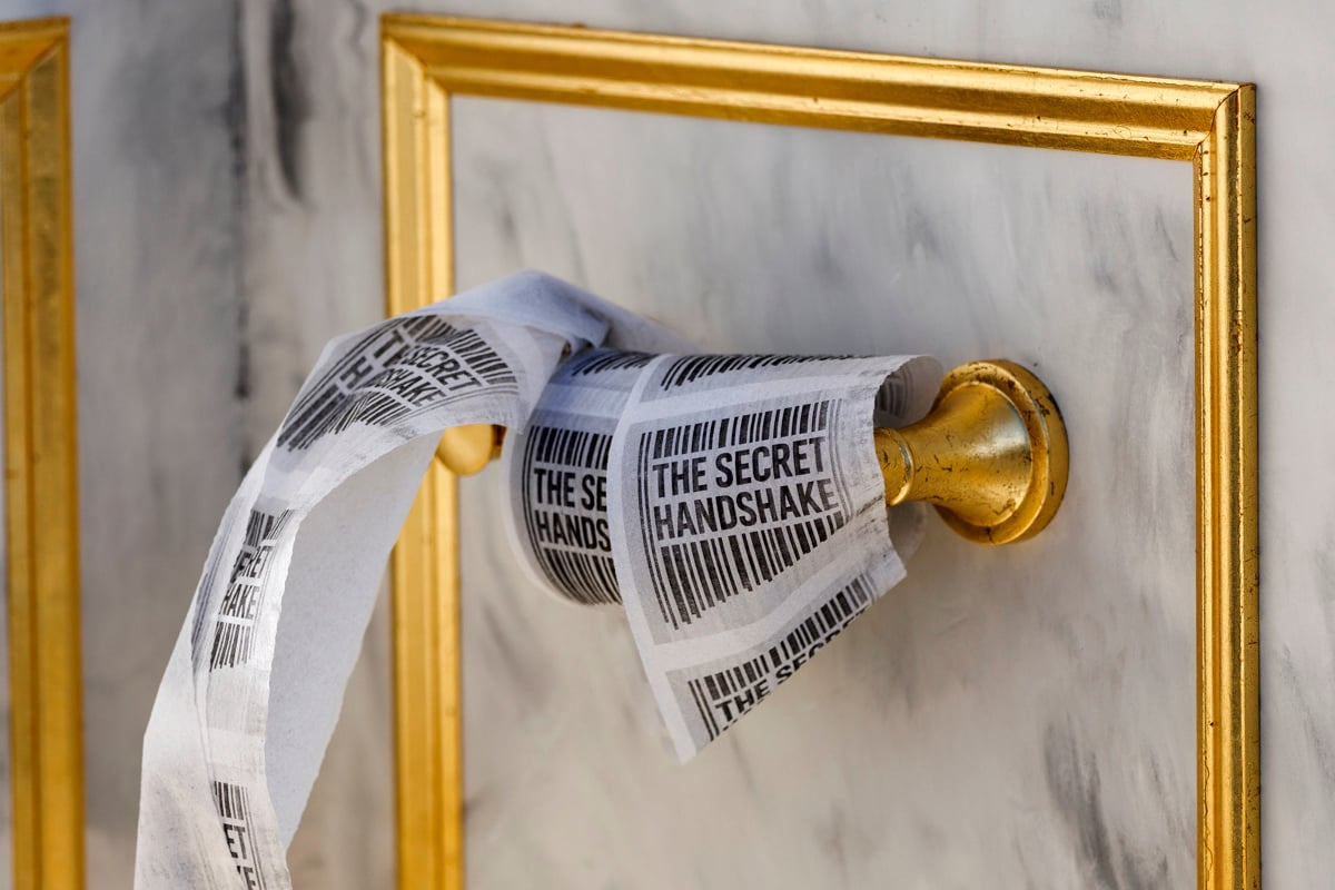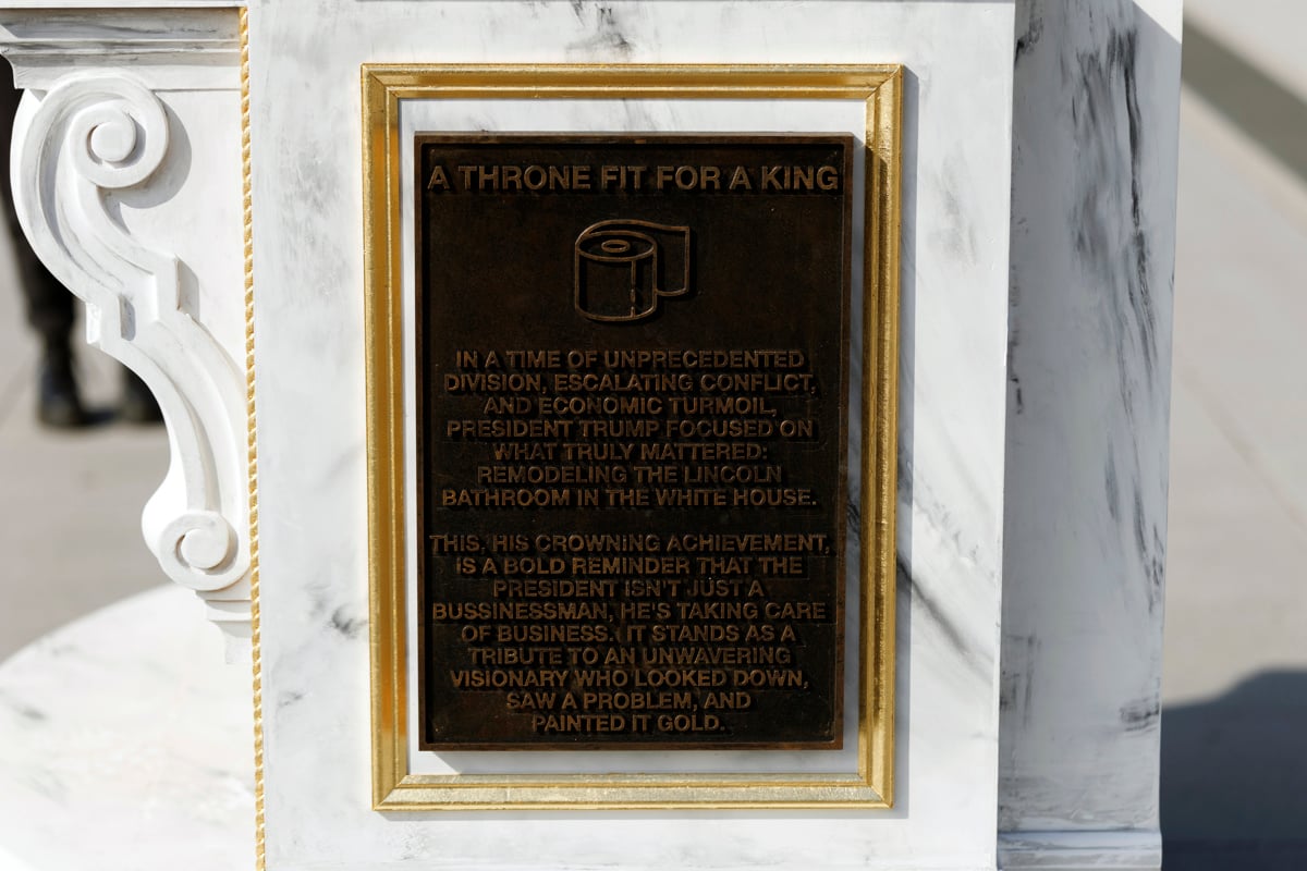 Nad instalacijo visi napis "Prestol, vreden kralja". Avtorji so na ploščo vklesali ironično sporočilo, ki se norčuje iz predsednikovih prioritet. Zapisali so, da se je predsednik Trump v času hudih delitev, konfliktov in gospodarskih pretresov osredotočil na tisto, kar je resnično pomembno: obnovo Lincolnovega stranišča v Beli hiši. "To je poklon neomajnemu vizionarju, ki je pogledal navzdol, videl težavo in jo obarval v zlato," še piše na plošči.