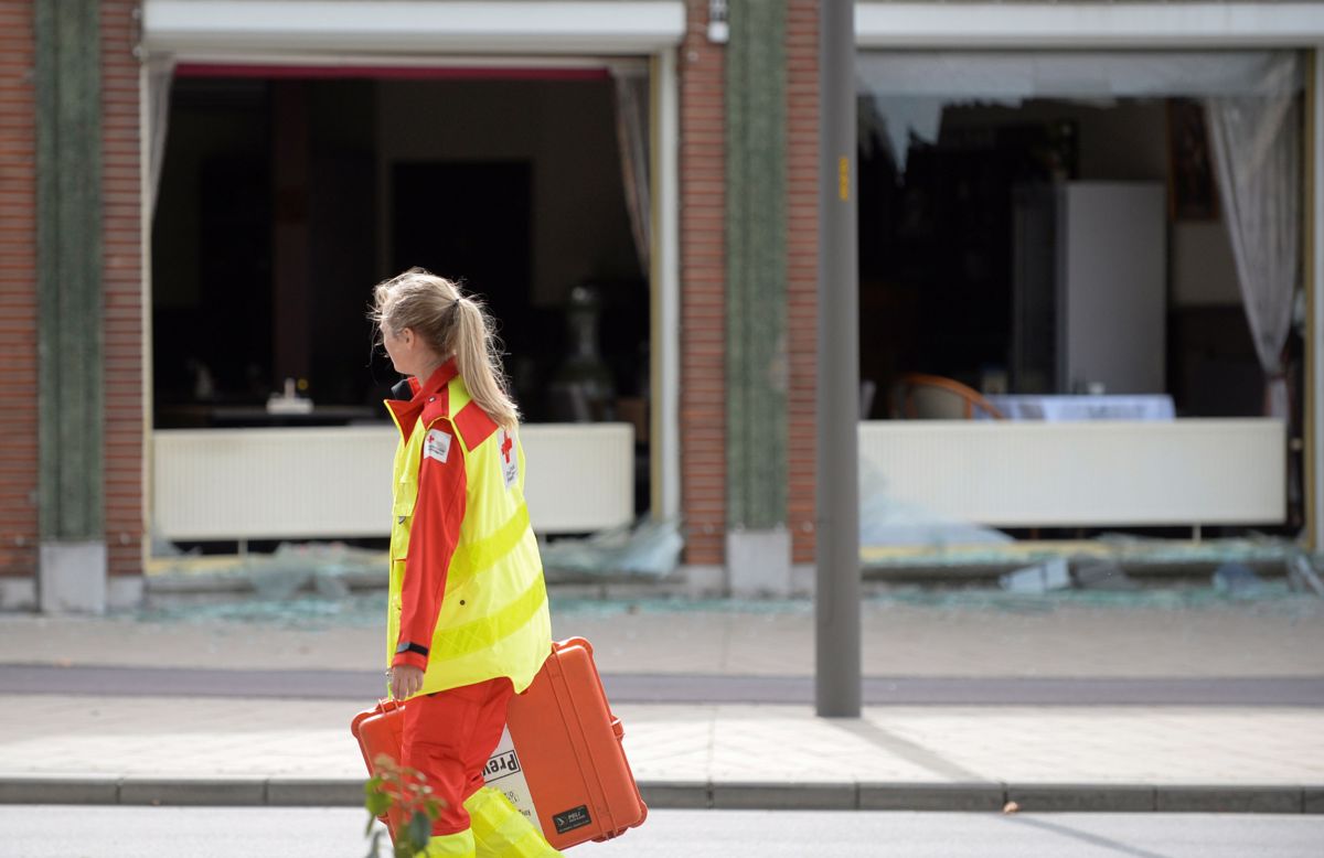 Pripadnica reševalnih služb na prizorišču eksplozije v Antwerpnu