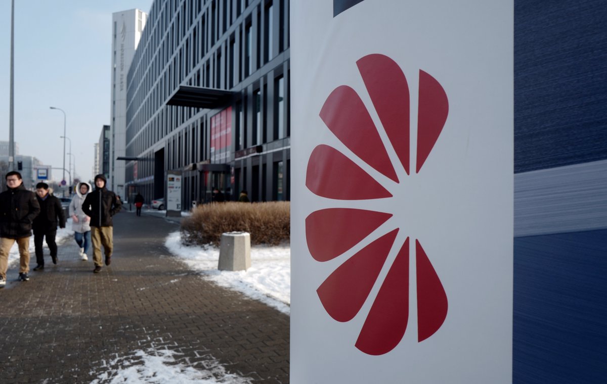 Logotip družbe Huawei pred njihovo poslovno zgradbo v Varšavi.