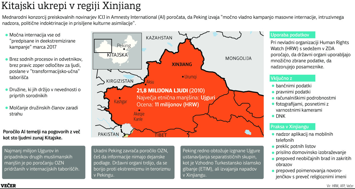 V javnost so pricurljali tajni kitajski dokumenti, ki osvetljujejo množično zapiranje pripadnikov etničnih manjšin, predvsem muslimanskih Ujgurov v avtonomni zahodnokitajski pokrajini Xinjiang. Med šestimi dokumenti večinoma iz leta 2017, do katerih se je dokopal mednarodni konzorcij preiskovalnih novinarjev (ICIJ), so tudi tajni seznam navodil oziroma priročnik za upravljanje "prevzgojnih" taborišč pa daljši telegram kitajske vladne komisije za ohranitev varnosti v pokrajini in tudi neka sodba iz leta 2018. Z njo so člana komunistične partije strpali v ječo za deset let. Obsojeni naj bi bil spodbujal narodnostno mržnjo, ker je drugim razlagal, da je treba "pred jedjo moliti ter se izogibati grdim besedam in gledanju pornografije".