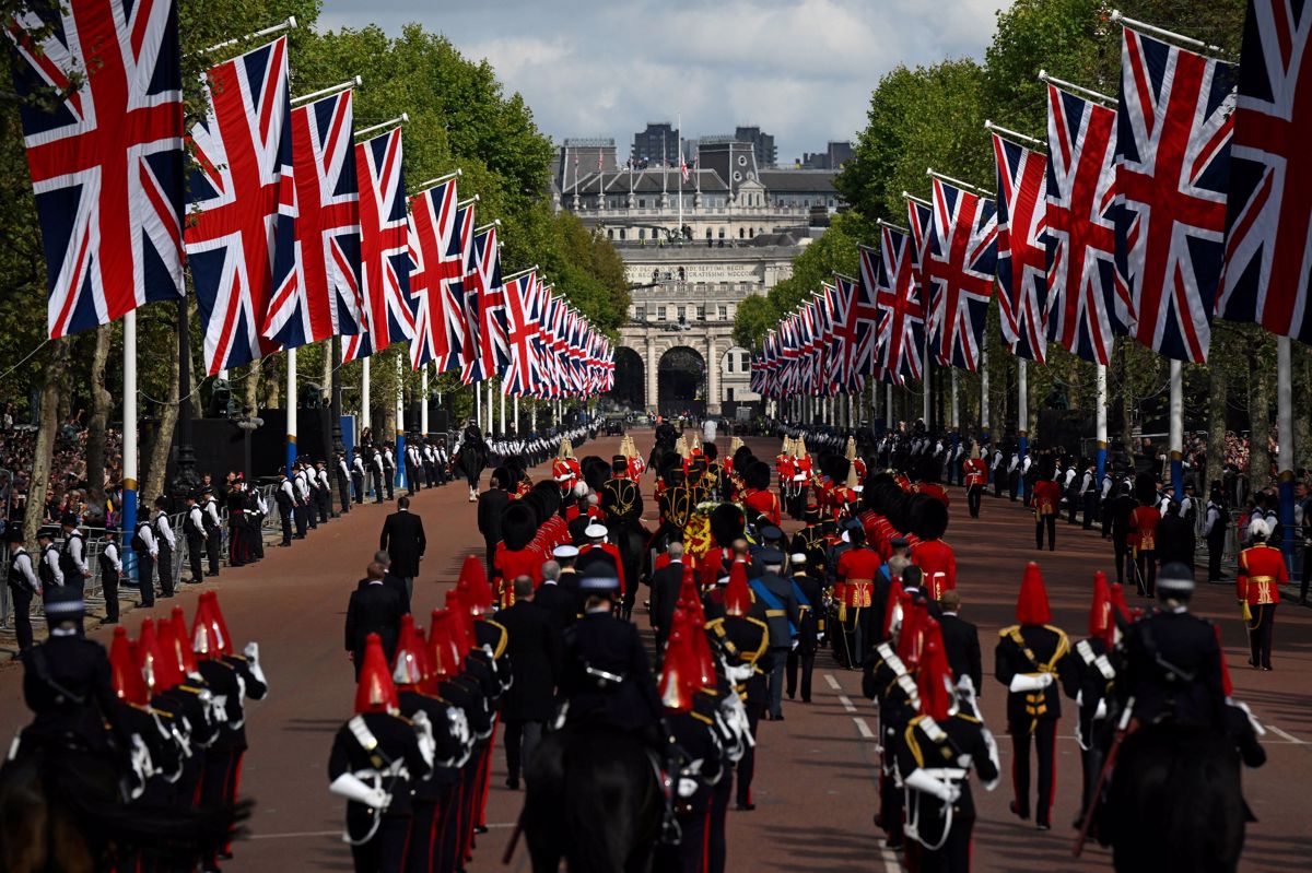 Sprevod iz Buckinghamske palače do Westminstra so množice spremljale v tišini, ki so jo vsako minuto prekinjale topovske salve, v 60-sekundnih intervalih pa je zvonil tudi bližnji Big Ben. Široka ulica The Mall, ki jo z obeh strani obdaja drevored, je bila skozi zgodovino tradicionalno prizorišče dogodkov v zvezi z monarhijo, nazadnje je tako junija letos tam potekal sprevod ob platinastem jubileju Elizabete II.