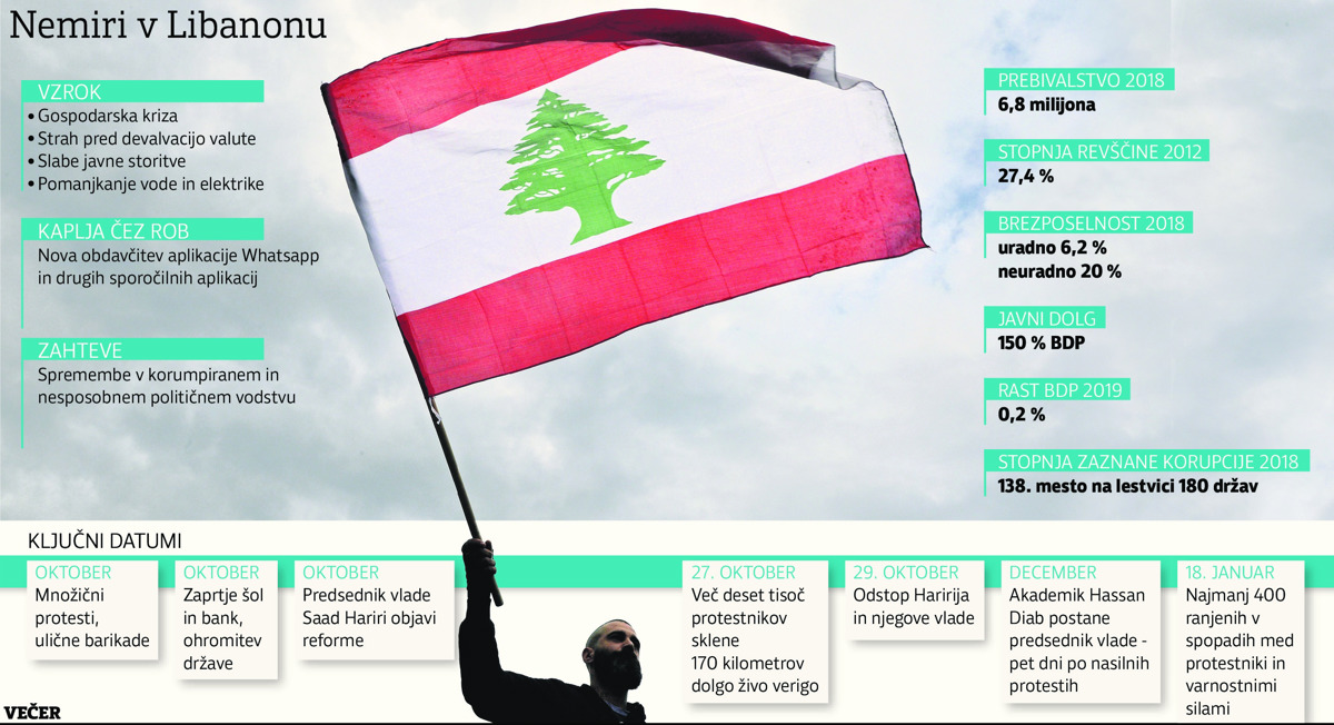 Tri desetletja po koncu dolgotrajne državljanske vojne, po več spopadih z Izraelom in med suniti in šiiti v Libanonu spet teče kri. Država, ki je pred medversko državljansko vojno 1975-1990 (ta je zahtevala najmanj 120 tisoč življenj) veljala za nekakšno Švico celotnega Bližnjega vzhoda, tudi po letu 2005 in umiku okupacijske sirske vojske pa bila znova na dobri poti v blagostanje, se je v zadnjih mesecih sesula kot hišica iz kart. Dalj časa gospodarska kriza, visoka brezposelnost in skorumpirana politika so pognale ljudi na ulice. Najprej so zahtevali odstop vlade premierja Saada Haririja in ga tudi dosegli, toda izkazalo se je, da to ni rešitev. Protesti, začeti oktobra, se nadaljujejo, eden najbolj krvavih dni pa je bil minuli konec tedna, ko je bilo na ulicah Bejruta ranjenih na stotine ljudi.