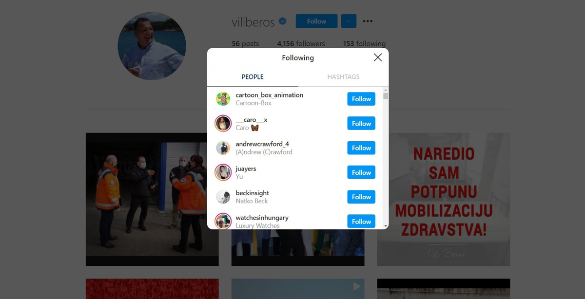 Instagram profil hrvaškega ministra za zdravje Vilija Beroša, ki je označen z modro kljukico, kar pomeni, da gre za potrjen profil, je sledil 154 drugim profilom, med katerimi so tudi nepričakovana imena, poroča hrvaški spletni portal Index.