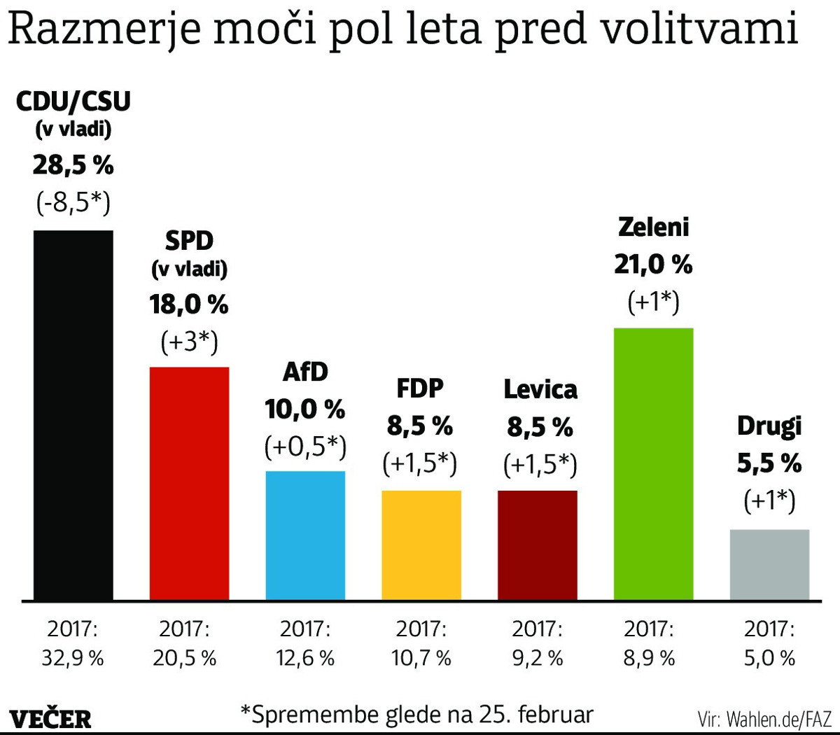 Pri tem Puschner navede, da bodo brezposelni, ki so odvisni od pomoči države, šele z majem dobili enkratno denarno pomoč v višini 150 evrov. "No, medtem pa so si nekateri politiki vladajočih strank brezsramno omastili brke, ko je šlo za nabave zaščitnih sredstev, recimo obraznih mask. Sicer ni prvič, da so vplivni lobiji Nemcem priskutili CDU in njeno bavarsko sestrsko stranko CSU. Toda škandali tokrat toliko bolj odmevajo, saj so se zgodili v jeku boja proti pandemiji. To je za marsikaterega volivca odločno preveč." CDU/CSU je na zadnjih volitvah leta 2017 zmagala in vknjižila 32,9 odstotka glasov. Sedaj ji po vseh anketah prednost iz tedna v teden rapidno kopni in je le še pri dobrih 28 odstotkih, in to potem, ko ji je bila podpora letos tudi že višja kakor na omenjenih zadnjih volitvah.