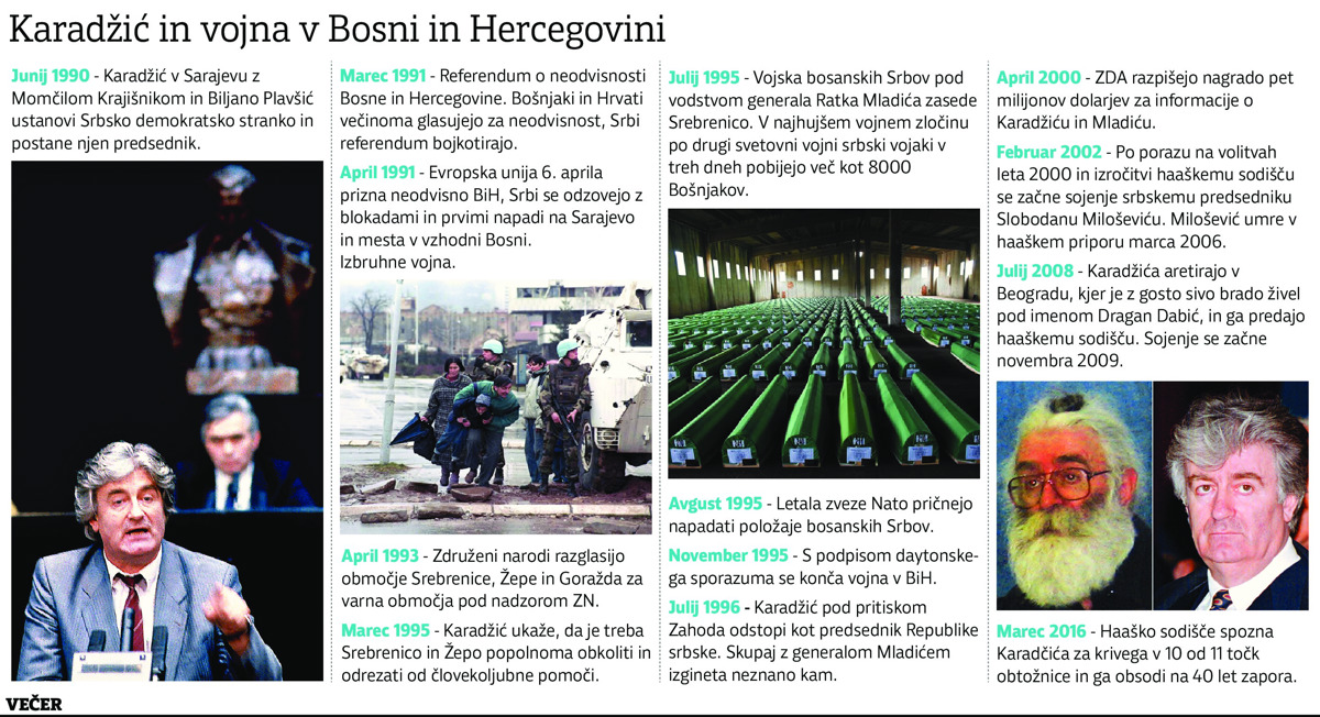 Mednarodno sodišče za vojne zločine na območju nekdanje Jugoslavije v Haagu je sicer 24. marca 2016 Karadžića obsodilo na 40 let zapora - za genocid v Srebrenici, vojne zločine ter zločine proti človečnosti med vojno v BiH. Spoznan je bil za krivega v desetih od enajstih točk obtožnice. Sodišče ga je kot takratnega predsednika Republike srbske in vrhovnega poveljnika vojske bosanskih Srbov spoznalo za krivega za genocid nad Bošnjaki v Srebrenici julija 1995, zaradi pregona, iztrebljanja, umorov, deportacij, prisilnih premestitev, nasilja, nezakonitih napadov na civiliste nesrbske narodnosti ter zajetja talcev med vojno v BiH med letoma 1992 in 1995. Med drugim so ga obsodili zaradi genocida več kot 8000 Bošnjakov v Srebrenici julija 1995 in večletnega obleganja Sarajeva, kjer je bilo ubitih več kot 10.000 ljudi.