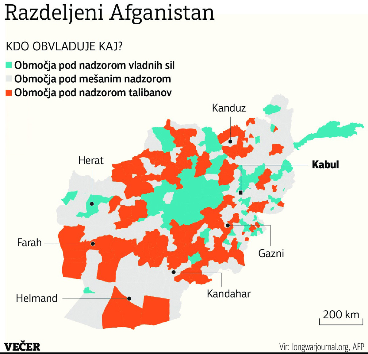 Toda Američani so, podobno kot Nemci, Britanci in Italijani, že odšli. V petek so zapustili svoje največje oporišče v Bagramu, kakih 60 kilometrov od Kabula, ki je od začetka vojne veljalo za simbol zahodne prisotnosti v Afganistanu. V soboto so bazo, kjer so letališko stezo zgradili še vojaki Sovjetske zveze v letih svoje vojne z Afganistanom, predali vladnim silam. Sposobnost afganistanskih sil, da ohranijo nadzor nad Bagramom, se bo po oceni tiskovne agencije AFP verjetno izkazala kot ključna za ohranjanje varnosti v samem Kabulu in pritiska na talibane. V zadnjih mesecih je bil Bagram večkrat tarča raketiranja, odgovornost za to pa so prevzeli džihadisti Islamske države, kar vzbuja strah, da talibani in drugi islamistični skrajneži že pripravljajo večje napade na bazo. Talibani sicer obvladujejo že tolikšen del Afganistana, da je pod njihovim nadzorom več prebivalcev kot pa pod kontrolo vladnih sil.