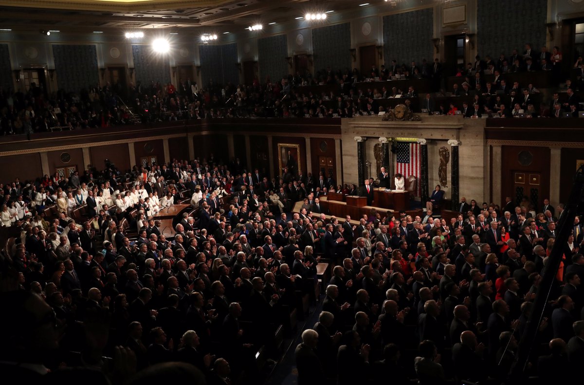 Za Trumpom sta sedela podpredsednik ZDA Mike Pence, ki je vstajal, in demokratska predsednica predstavniškega doma kongresa Nancy Pelosi, ki je večinoma sedela in ob Trumpovi omembi gospodarskega čudeža in preiskav vidno zavila z očmi.