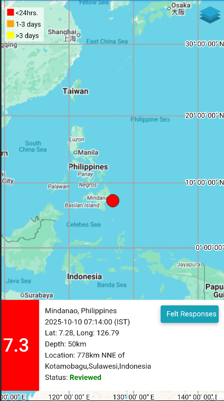 Po podatkih ameriškega geološkega zavoda (USGS), ki spremlja seizmično aktivnost po vsem svetu, so potres zabeležili okoli 9.40 po krajevnem času (03.40 po srednjeevropskem času). Žarišče je bilo približno 20 kilometrov vzhodno od obale Manaya v regiji Mindanao, na globini okoli 60 kilometrov.