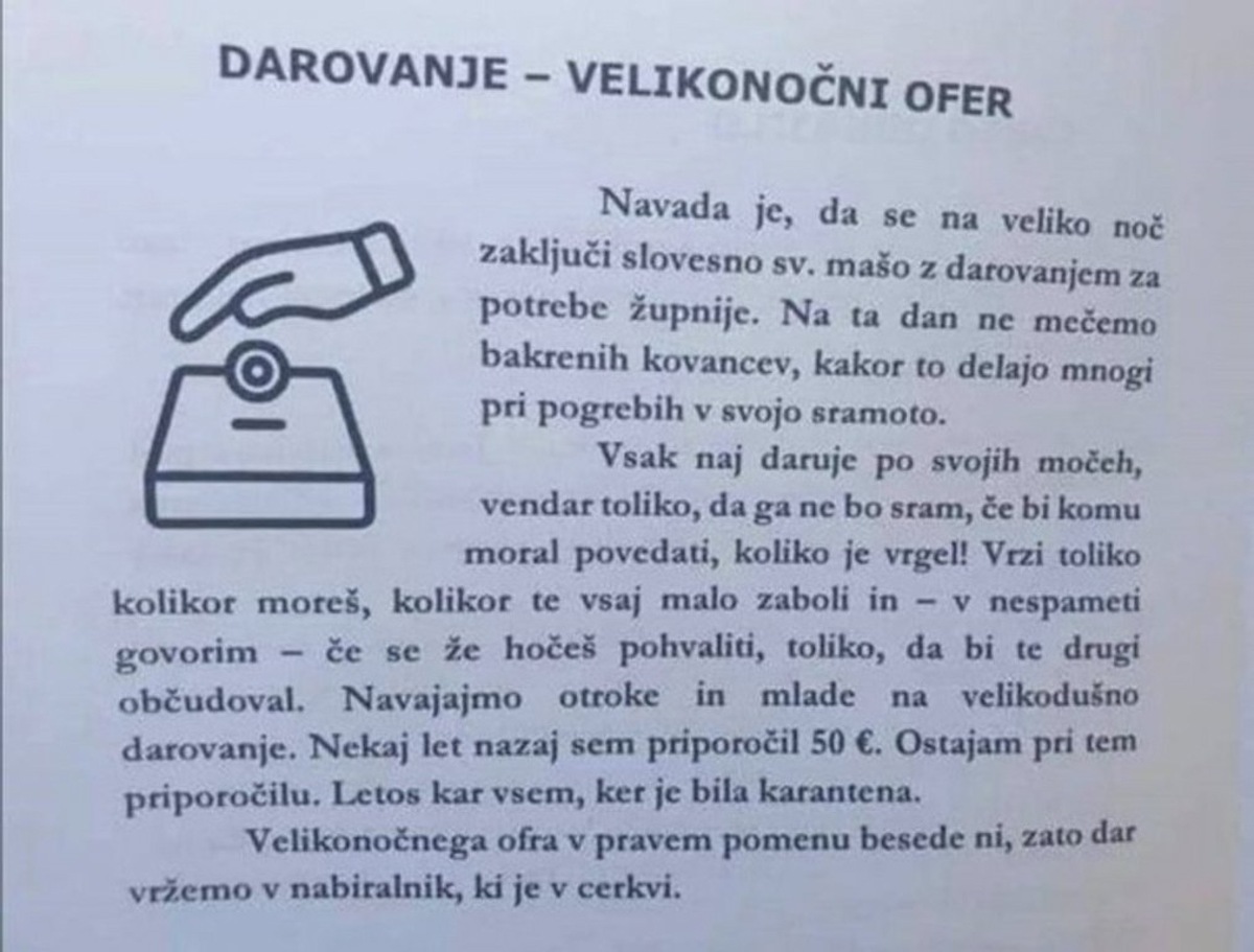 Univerzalni temeljni dohodek bodo duhovniki prejemali še vsaj junija. Torej koristijo državno pomoč, ki je ni deležen vsak, mnogi je sploh niso dobili ali pa so jo v bistveno manjšem obsegu, čeprav so v pandemiji ostali brez vsakršnih dohodkov. Zaradi tega je dodatno "prosjačenje" skrajno neprimerna poteza. Nezadovoljstvo v številnih spletnih skupinah in tvitosferi so mnogi izražali že, ko so slovenski škofje podprli Janševo vlado; njegova povratna finančna pomoč katoliškemu zavezniku je na nasprotnem polu sploh ustvarila "proticerkveno" razpoloženje, kakršnega ni mogoče pomniti niti v rajnki komunistični Jugoslaviji. Iz njega jasno izluščimo, da je, z delno izjemo papeža Frančiška, naša RKC na nekaterih področjih zašla s Kristusove poti.