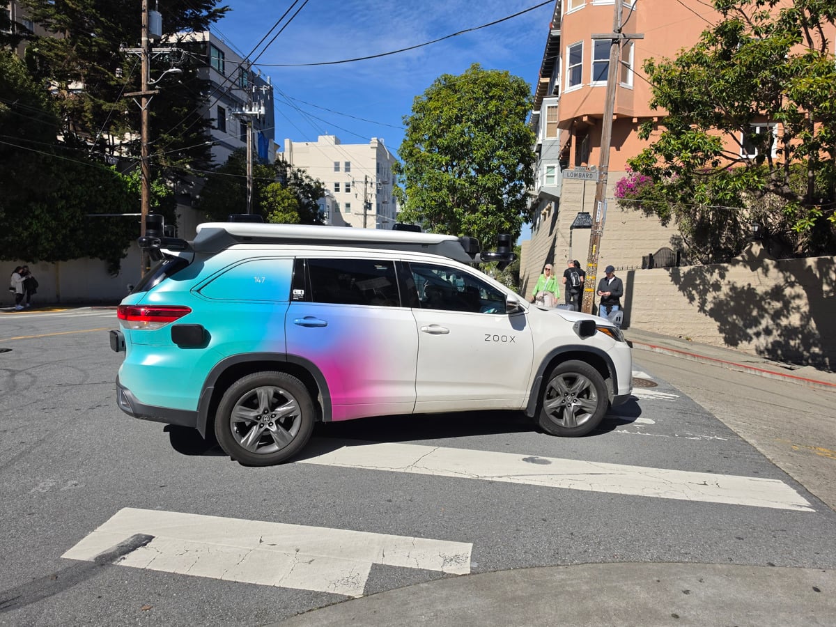 Že na poti od letališča proti našemu hotelu je padla odločitev, da bo treba nujno preizkusiti katerega izmed robotskih taksijev, ki naj bi jih po ulicah San Francisca vozilo okoli tisoč. Ko smo sedeli v običajnem taksiju na petpasovnici, ki vodi proti centru mesta, smo ob sebi že po nekaj kilometrih na sosednjem voznem pasu opazili belo vozilo z mavričnim zadkom, ki je imelo na strehi nameščeno posebno enoto s senzorji in kamerami ter bočne "izrastke", v katerih so se prav tako skrivale za avtonomno vožnjo potrebne naprave. Toda za volanom je sedel voznik. Na vozilu smo opazili napis Zoox, mi pa smo iskali ponudnika Waymo in ni trajalo dolgo, da smo ga našli. In to ne enega.