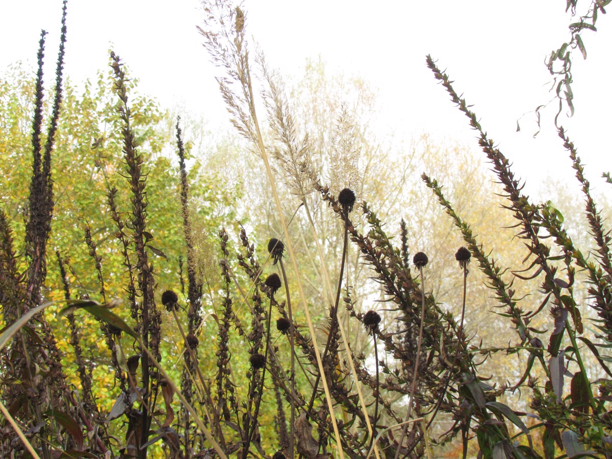 Porežemo vse grde ostanke rastlin in pustimo tiste, ki bodo dajale lepo zimsko sliko. Ni nujno, da prav vse suhe dele sproti odnašamo na kompost in si delamo dvojno delo. Če so ostanki zdravi in se hitro razgradijo, jih lahko zdrobimo ali razrežemo na krajše oziroma manjše kose ter jih med grmovnice in trajnice razporedimo kot zastirko.