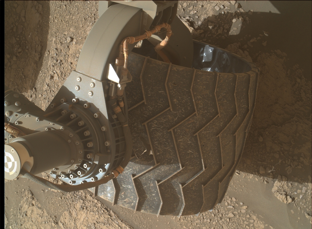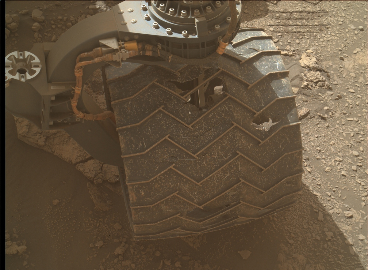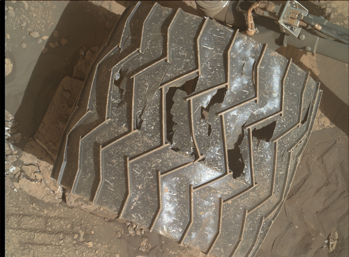 Nasin rover Curiosity (Radovednost), ki tačas raziskuje Mars, je opremljen z odpornimi aluminijastimi kolesi, ki pa so zaradi ostrega kamenja na Rdečem planetu že pošteno zdelana. Ameriška vesoljska agencija je s pomočjo robotske roke posnela in na svoji spletni strani objavila sveže fotografije, ki kažejo precej uničena in preluknjana kolesa.