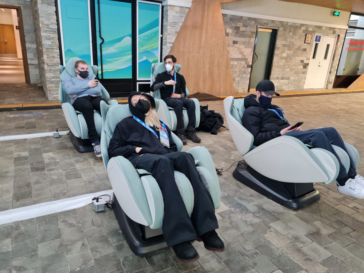 Kolega snemalec RTV me je ondan pričakal na masažnem stolu. Enem od šestih, ki stojijo v avli pred tiskovnim središčem v Zhangjiakouju. "Veš, kak' to dobro dene. Po celem dnevu tekanja po prizoriščih pridem sem crknjen in potem si redno privoščim masažo. Sedeš na oblazinjeni stol, stisneš on, nastaviš v položaj za ležanje in potem vključiš general." Program, ki te gnete, treplja, trese, ki ti po mišicah spušča impulze. "V trgovini poleg samo še kupim mrzlo pivo in to je to," zaključi on, ki pravi, da je doma na Ptuju.
